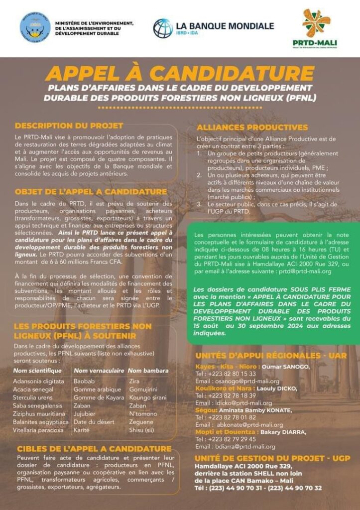 Plans d´affaires dans le cadre du développement durable des produits forestiers non ligneux (PFNL) Compétences Posté le 28 août 2024 ← Asociation de jeune du marché des céréales dans les campagnes de Sikasso